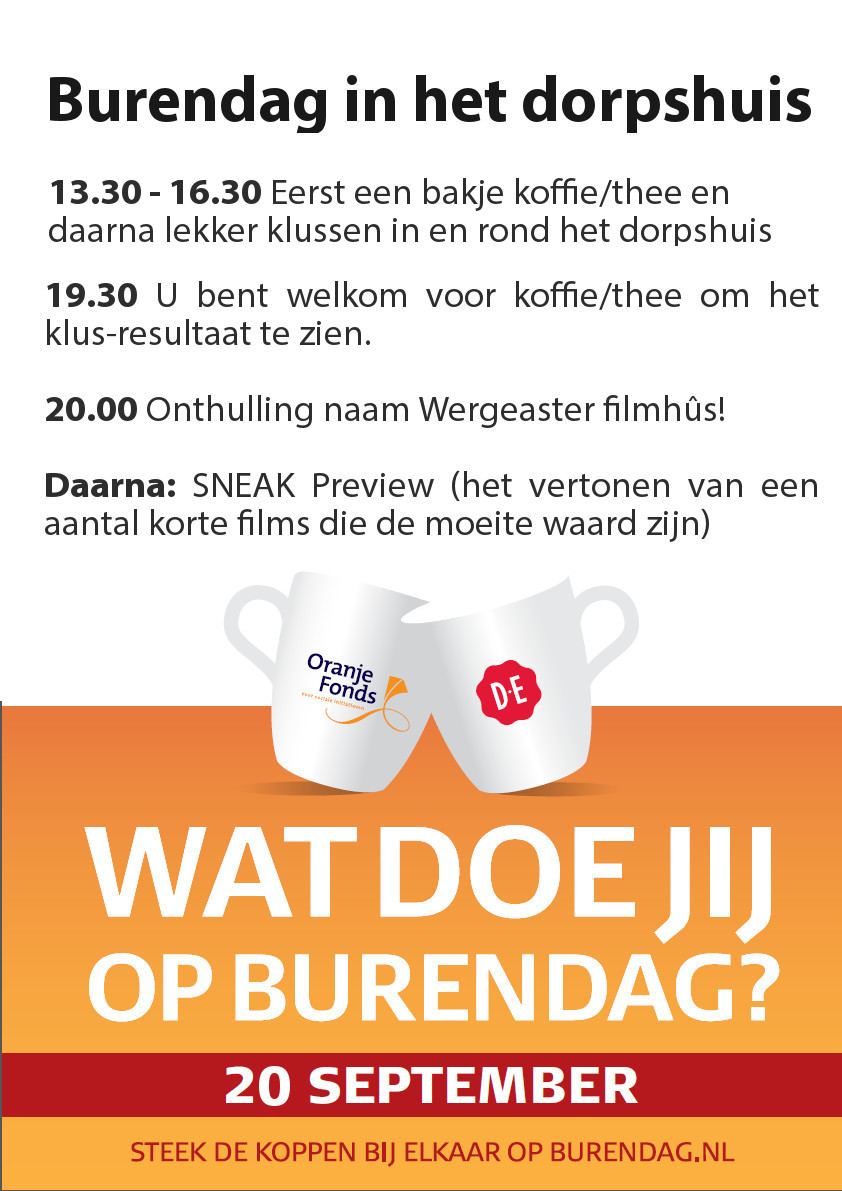 Vrijdag 20 september kunt u voor burendag terecht in Us Doarpshûs. Klik op de afbeelding voor het programma.Voor meer informatie: zie Havensbank van augustus (bladzijde 8). We laten 's avonds een aantal korte films zien, die zeer de moeite waard zijn. We hopen zoveel mogelijk mensen te zien!