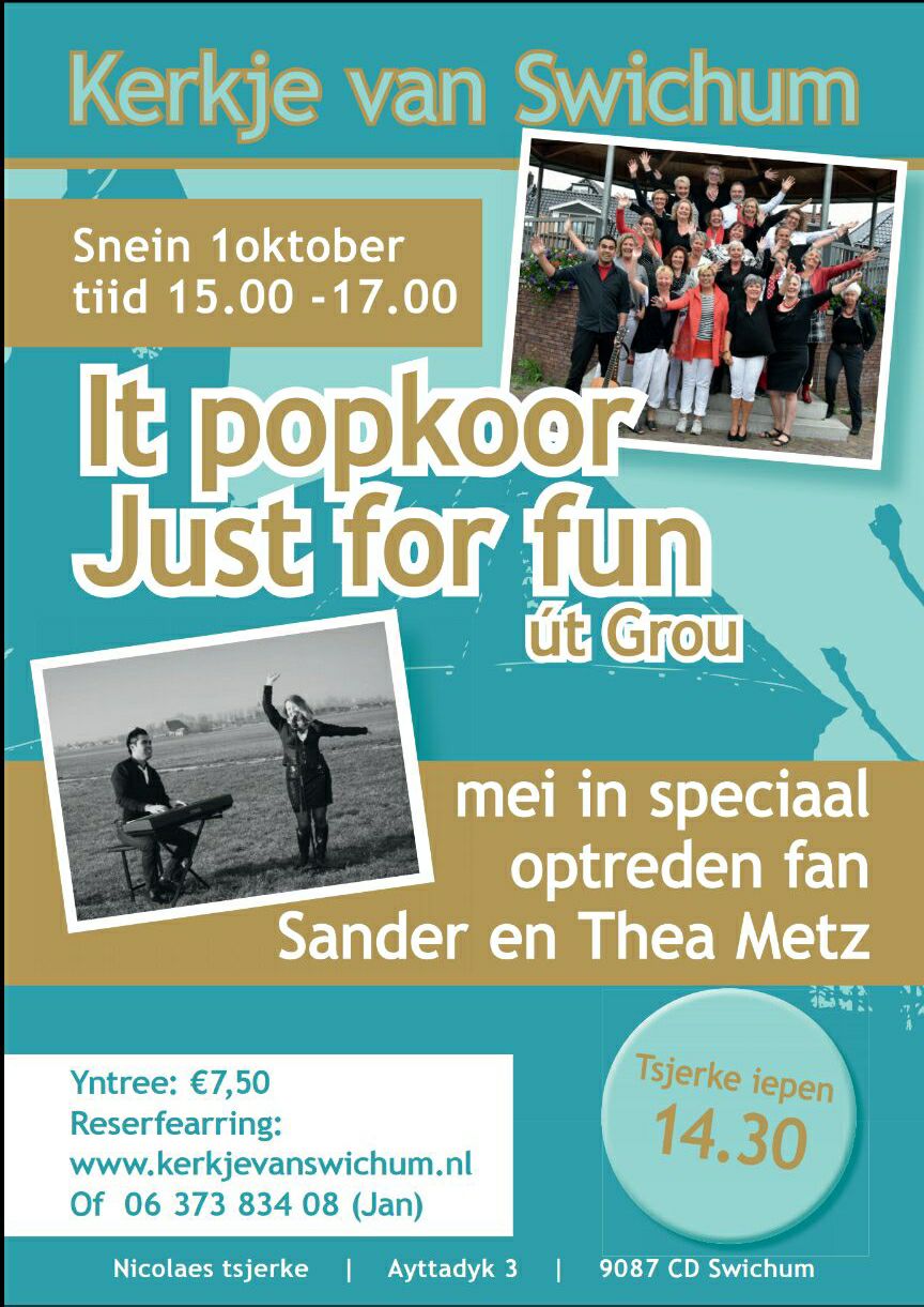 Snein 1 oktober treedt popkoor Just for fun út Grou op yn it tsjerkje fan Swichum. Mei in spesjaal optreden van Sander en Thea Metz! Klik op de illustraasje foar mear ynformaasje.
