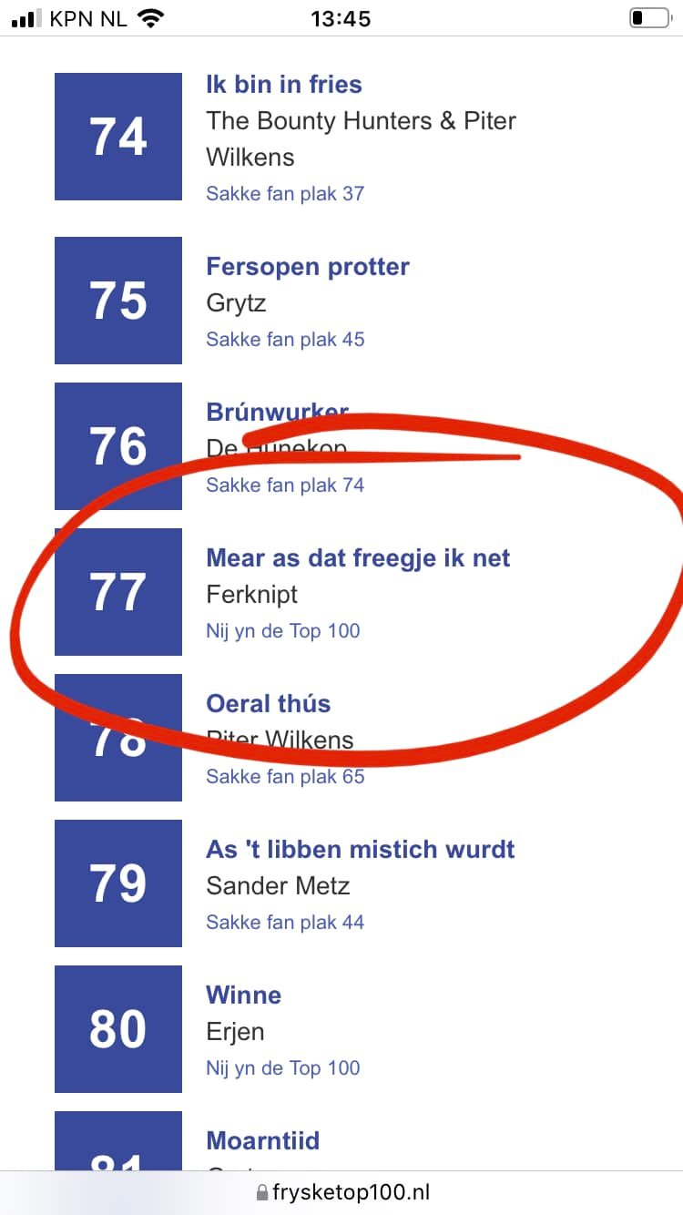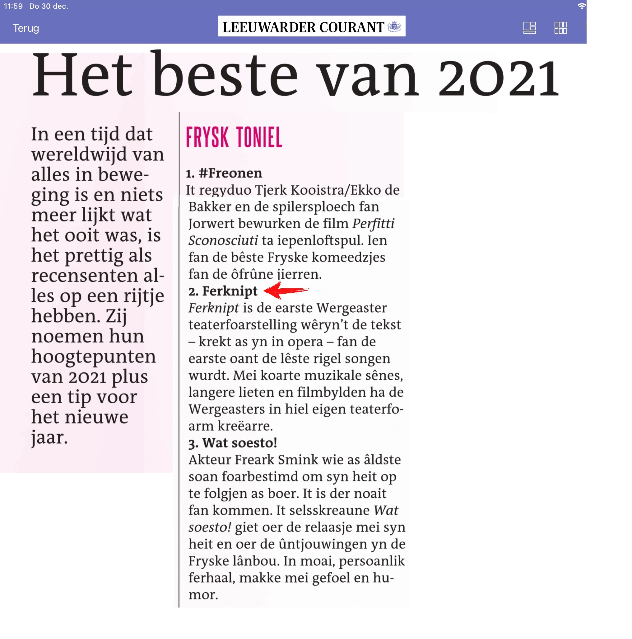 Na alle voorbereidingen en voorstellingen kan er geoogst worden. Het nummer "Mear as dat freegje ik net" staat op nummer 77 in de Fryske Top 100. En in het jaar-overzicht van de Leeuwarder Courant staat Ferknipt op nummer 2 in de categorie "Frysk Toniel". Een prachtig resultaat!