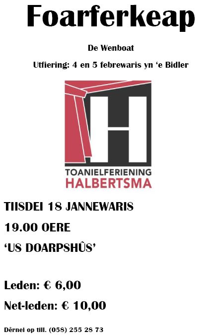 Foarferkeap Toanielferiening Halbertsma op tiisdei 18 jannewaris om 19.00 oere yn Us Doarpshûs.