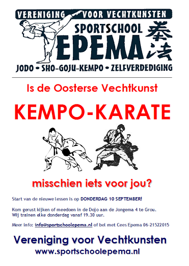 In september starten nieuwe lessen Kempo-karate bij Sportschool Epema in Grou. Klik op de poster voor meer informatie.