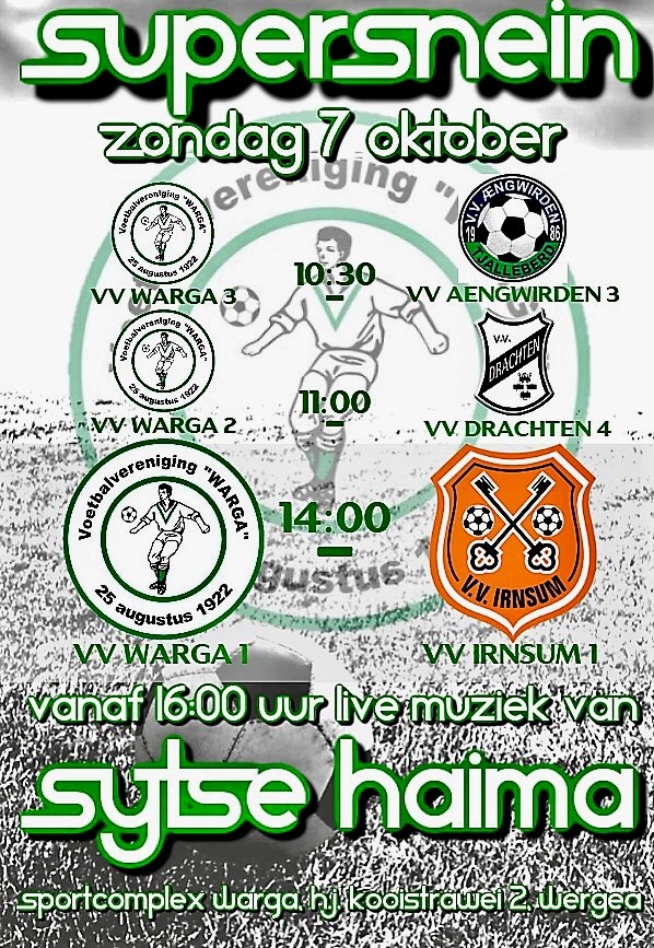 De seniorenteams van v.v. Warga spelen dit seizoen in het algemeen op dezelfde zondag hun thuiswedstrijden. Dit heeft voor- en nadelen, maar een mooi voordeel is dat er vaker iets extra's wordt gedaan op deze superzondagen, deze 'supersneinen'. Zoals bijvoorbeeld komende zondag: na afloop van de drie thuiswedstrijden, vanaf 16:00 uur live muziek.