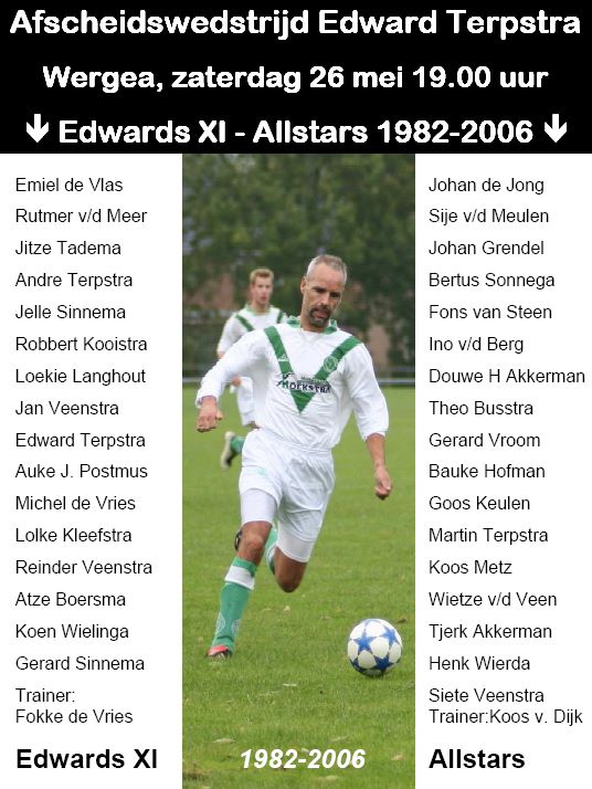 Ook wordt afscheid genomen van André Terpstra, Michel de Vries, Rutmer van der Meer, Hendrik Tolsma en Emiel de Vlas. Edward Terpstra heeft op verzoek zijn favoriete elftal samengesteld uit de spelers waarmee hij heeft samengespeeld. Dit elftal speelt tegen een allstar team van 1982 tot en met 2006 geselecteerd uit tegenstanders van Terpstra. De wedstrijd staat onder leiding van betaald voetbalscheidsrechter Hessel Steegstra.