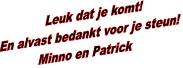 Je inspanning vieren we samen en sluiten we af onder het genot van gezonde broodjes en een lekkere kop soep in de fitnessruimte van Sportstad Heerenveen. De begeleiding en accommodatie van Spinn2Run wordt belangeloos aangeboden door Sportstad Heerenveen. Alle opbrengsten komen rechtstreeks ten goede aan KWF. Na aanmelding krijg je een bevestigingsmail met nadere uitleg en instructies. Lukt het je niet om deze dag met mij mee te sporten, dan kun je ons sponseren via de link:Voor Minno: http://deelnemers.opgevenisgeenoptie.nl/acties/minnokamp/minno-van-der-kamp/ Voor Patrick: http://deelnemers.opgevenisgeenoptie.nl/acties/patrickvink/patrick-vink/ Of via de website www.opgevenisgeenoptie.nl via het tabblad “Alle acties” zoeken op “Minno van der Kamp” of “Patrick Vink”.