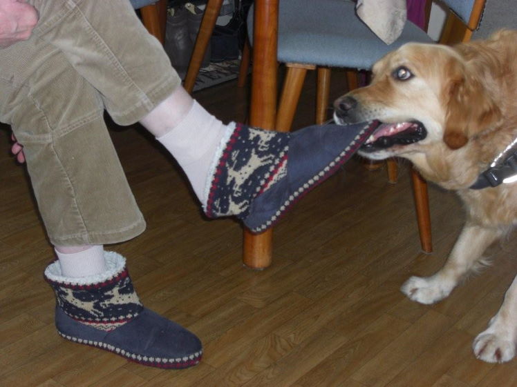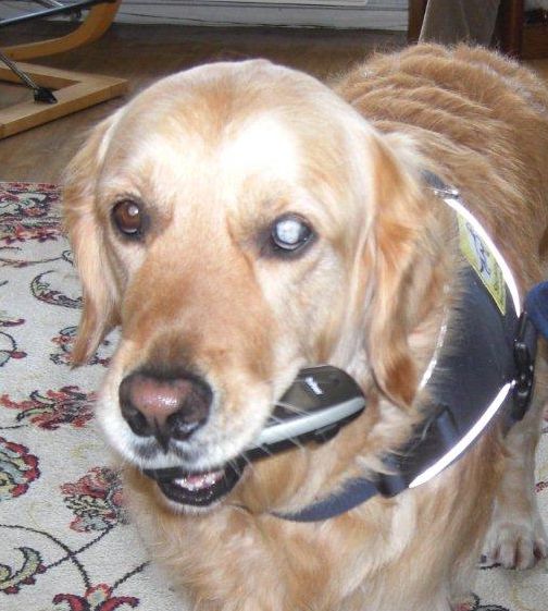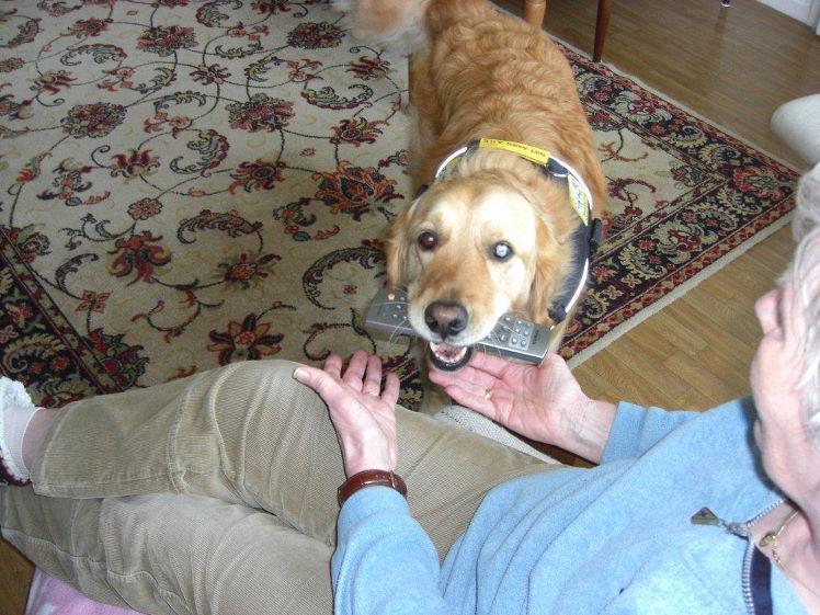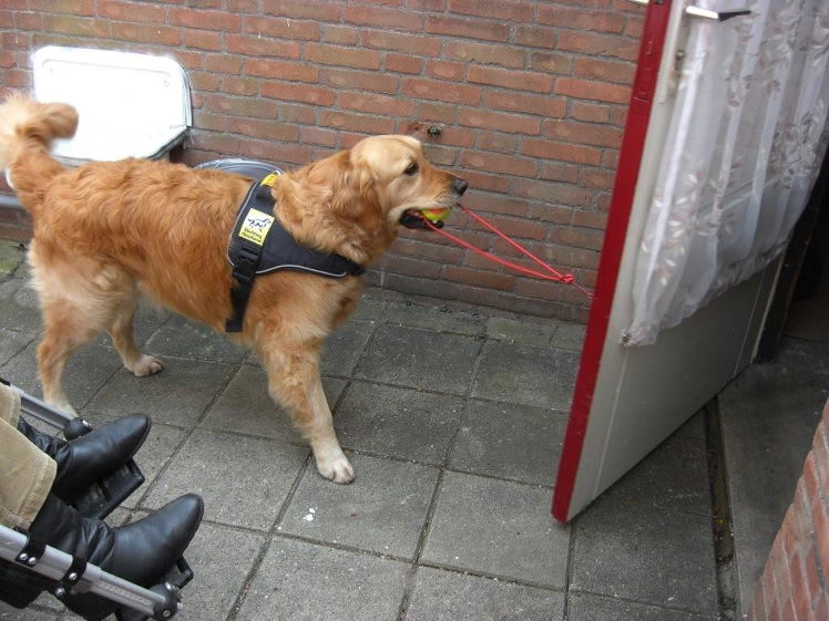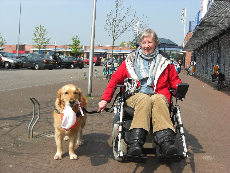 Naast het feit dat Odwin natuurlijk een buitengewoon aangenaam gezelschap is, is zijn hulpvaardigheid een enorme uitkomst voor zijn bazin. Met name omdat haar gezondheid begon te haperen: ze werd steeds slechter ter been. Als de rolstoel zijn intrede gaat doen, wordt Odwin nagenoeg onmisbaar. Bijvoorbeeld bij het openen van deuren. Maar dat bracht ook problemen met zich mee. Niet overal is een hond zomaar welkom. Tenzij hij een ‘erkende hulphond’ is. Die krijgt een dekje om met dat predicaat. Trynke besloot contact op te nemen met de betreffende stichting om Odwin daarvoor aan te melden. Om een lang verhaal kort te maken: de stichting reageerde aanvankelijk terughoudend, maar bezweek na de kennismaking terstond voor de enorme vaardigheden van de Retriever. Even dreigde de medische keuring nog roet in het eten te gooien, omdat Odwin zelf óók een handicap heeft. Zijn linker oog is namelijk op jonge leeftijd ernstig beschadigd geraakt na een wat onhandige actie met het apporteren van een tak. Het gezichtsvermogen is waarschijnlijk aan die kant minder dan 10%. Gelukkig bracht een positieve verklaring van de oogarts uitkomst. Niets stond erkenning toen meer in de weg. De stichting bood vervolgens aan om een cursus ‘rolstoelbegeleiding’ voor Odwin te regelen. Na één les was echter al duidelijk dat men de hond eigenlijk niets meer hoefde te leren…