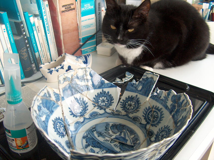 Niak moast lykwols wakker omstean leare. De hiele earste dei hat er him ferstoppe efter de tillevizjekast. Mar stadichoan waard hy frijer en rekke hy wend oan Thea en sy oan him. Op ien fan syn sneuptochten troch de wente foel syn each op in erfstik: de porsleinkast. It útsicht fan dy kast ôf oer de keamer moat fantastysk wêze, tocht er. Thea seach him sjen, begrypte wat er yn’t sin hie doe’t er op it bekling fan de learen fauteuil wipte. Sy joech in gjalp wylst er de sprong weage. Faaks dêrtroch rekke Niak justjes de fierste fan de trije Delfts blauwe kommen dy’t de kroan fan de kast siere. De kom makke in healslach, like te wifeljen en mitere doe nei ûnderen. Nettsjinsteande it sachte tapyt foel er yn wol hûndert diggels. Wakker deselde diggels as doedestiids. Yndie, it wie dyselde kom dy’t Thea sels lime hie. De foaroarlochske lym hat ik net hâlden...