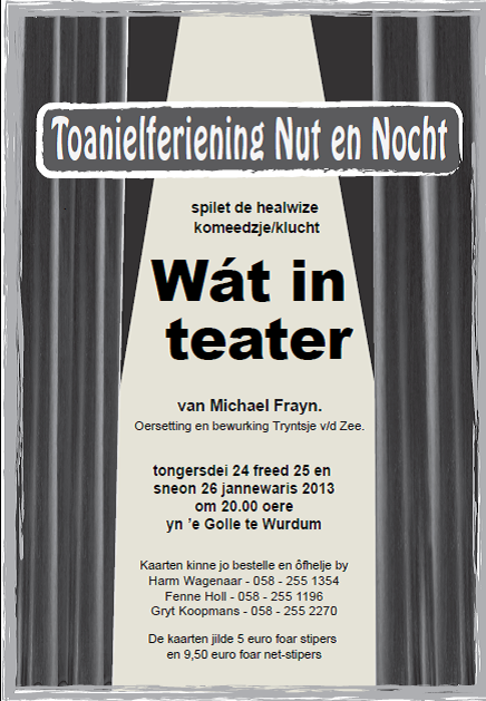 Nut en Nocht spilet op 24, 25 en 26 jannewaris, yn de Golle te Wirdum, de healwize komeedzje/klucht “Wát in teater”