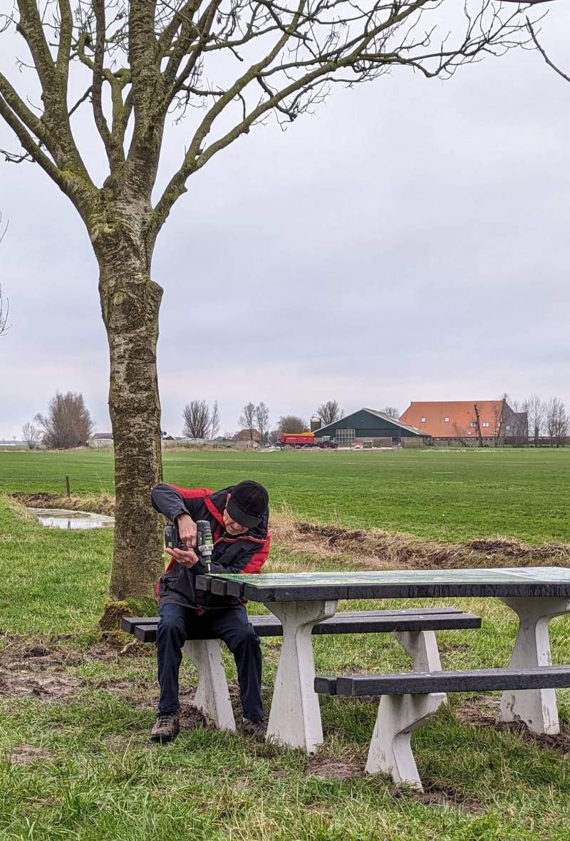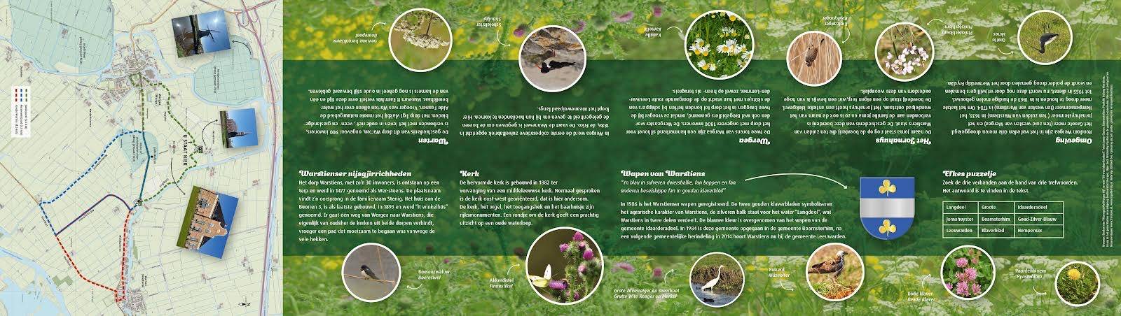 Er was koek en zopie bij Annie Boermans. Germ Kupers verhoogde de feestvreugde door vrolijke nummers op zijn accordeon te spelen. Na het welkomstwoord door Annie (namens de groene groepen uit Warten, Warstiens en Wergea) kreeg Sjoerd Spijkstra het woord. Hij vertelde hoe het landschap er lang geleden uitzag en wat we er nu nog van kunnen zien. Daarna liepen we naar de picknicktafel achter de camping, waar de " burgemeester van Warstiens" de heer Gerbens de laatste schroef op het informatiebord aan bracht. Weer een mooi plekje erbij in onze omgeving!